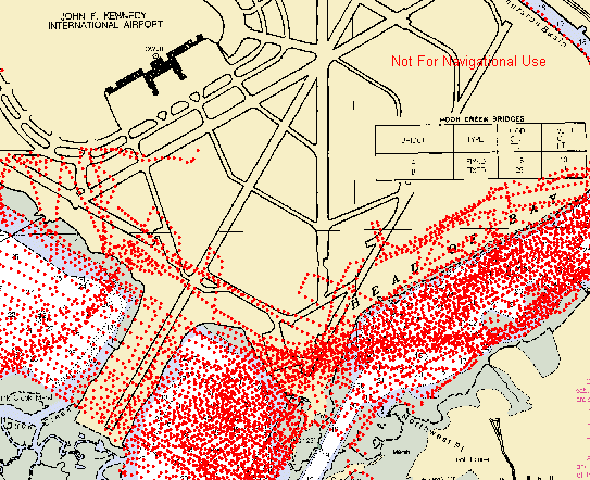 One application of this extension has been to illustrate landfill in the New York harbor to create the John F. Kennedy International airport. Figure 1 shows historic NOAA bathymetry data locations overlaid on the most current nautical chart for Jamaica Bay in New York harbor. The bathymetry points that fall on land indicate areas of landfill in the harbor.