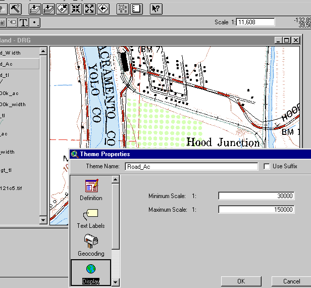 In ArcView, a variety of digital sources can be displayed for a visual assessment of data quality. These include GIS data themes, images, and primitive graphic objects or shapes. ArcView has recognized that GIS themes from different sources have different display requirements. When the units of a View are identified, the display window calculates a display scale. Based on the display scale, we can set thresholds for display as a theme property.