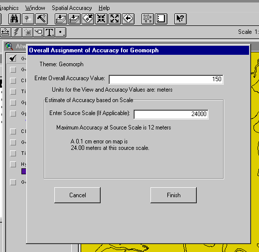 This dialog is for entering an overall value of accuracy for the theme. The units for this value are the units of the View. The dialog provides help in estimating this value if the source scale of the GIS theme is known. The extension calculates two different estimates of accuracy based on a source scale. These estimates are reported in View units. In this example, the source scale of the GIS theme is 1:24,000 and the View units are meters. The first estimate is based on the former National Map Accuracy Standards. For a scale of 1:24,000, 90 percent of well defined points should be within 12 meters of their true location. The second estimate is based on a displacement or symbol size on the source map of 0.1 cm. In this example, a displacement or symbol width of 0.1 cm represents 24 meters on the ground. Based on this value, the user can measure the feature on the source map and calculate a value. For controlled GPS data or where measurements have been made in the field, source scale is not appropriate and the reported value is entered. For this particular theme, Atwater reported values of uncertainty in his source documents and this value (150 meters) is entered. Once a value has been entered, a report on spatial accuracy, uncertainty, or the dimensions of features is written to the comment section of the theme. The theme name and the value associated with the theme is stored in lists for access as the user changes the display scale of the View.