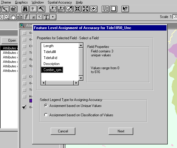 When accuracy values are based on theme features, the user selects a field from the theme attribute table. Figure 11 shows the dialog for selecting a field from the theme attribute table.