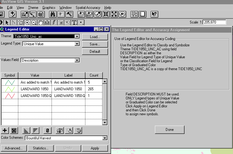 Figure 12 shows the Legend Editor for classifying and assigning symbology. This is the normal Legend Editor for ArcView. For the extension, two legend classification methods are permitted. The user may symbolize the theme based on unique values for the field or may classify and symbolize the field with graduated color. Other classification methods are not useful for this extension. The extension resets the symbol size based on the values assigned to the feature. The dialog that is open with the Legend Editor provides information for the user. Once the Apply and Done buttons are clicked, the extension evaluates the user assigned legend and proceeds to the final step of assigning values for accuracy, uncertainty, or dimensions. Before this final step, a legend file containing the parameters of the legend is saved.