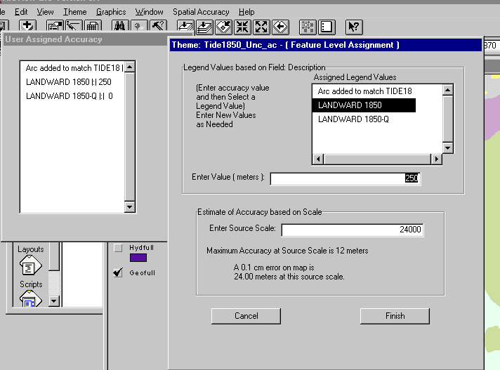 This step opens two dialogs. One dialog displays the assigned values for each class in the legend. The main dialog displays each class in the legend and a field for entering a value for accuracy, uncertainty, or dimensions. Once a value has been entered, this value is assigned to any legend classes on which the user clicks. The dialog also provides a field for entering the source scale of the theme. Entering a source scale provides the same information that entering a scale does for assigning an overall accuracy value.