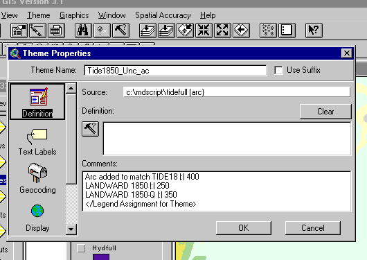 Themes selected from the display list will have their symbols adjusted as the display scale changes. The user can adjust the legend at any time for the themes with the Legend Editor. Changes must be consistent with the assignment of accuracy values to the theme. This is particularly true where the user has assigned accuracy values to a theme's features. If the number of classes or a different field is selected for symbolizing that theme, the extension will reset the legend to the saved legend or .avl file.