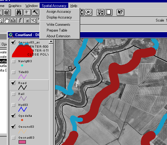 ArcView is an excellent platform for viewing spatial data in a variety of formats from different sources. The data developer or evaluator can view separate sources and make an assessment of accuracy or uncertainty based on the best source for those features. The spatial accuracy extension is designed as an exploratory tool for displaying what is known or can be inferred about the spatial accuracy or uncertainty of a theme. It allows the user to assign a value for accuracy, uncertainty, or dimensions, evaluate that assignment in the View display, and report on that assessment. Any theme with point, line, or polygon topology can be used. In ArcView, multiple themes can be generated from the same GIS data source and assigned different accuracy values for visual display and evaluation. The spatial accuracy extension: