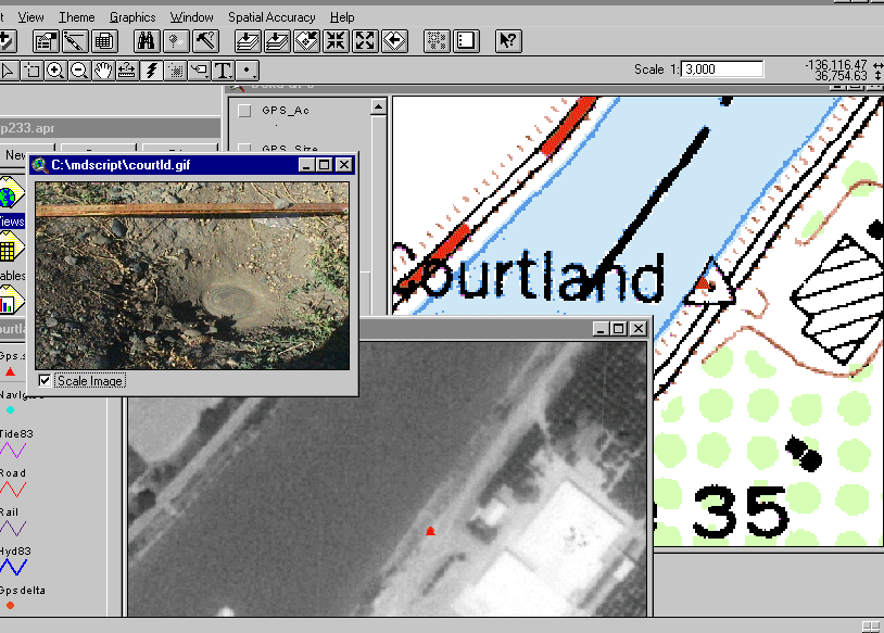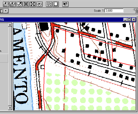 Figure 2 displays an image in ArcView with GIS themes of roads and railroads. The digital raster graphic (DRG) for the Courtland California 7.5 min quad is displayed as a back ground image. The GIS data themes were captured from a 1:100,000 scale source. Displacement of features between the data sources can be clearly seen in the ArcView display.