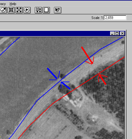 Comparison between these sources for this portion of the Courtland quad show a displacement of 8 to 12 meters for the hydrography theme and 15 to 30 meters for the road theme. Arrows in the figure indicate areas showing the maximum displacement. The DOQ was constructed based on the North American datum of 1983(NAD1983). The GIS data themes were both developed using the former datum (NAD1927). From the visual inspection of the data, it is not possible to identify what displacement is due to differences between the two datums, changes in the river channel or road location between the dates of the various sources, scale differences in the sources, or errors in digital data development. However, it is possible to estimate the accuracy or uncertainty in the location of the roads and hydrography relative to the DOQ image. It provides a guide as to what the minimum scale should be for display of these two themes. Estimating the accuracy of position based on source scale alone can be misleading.