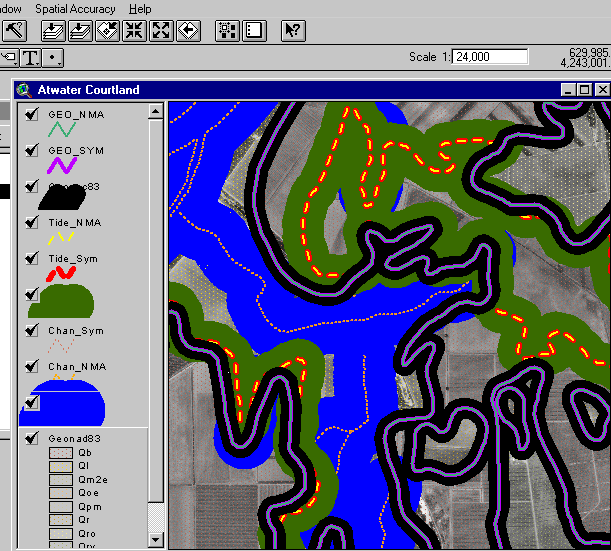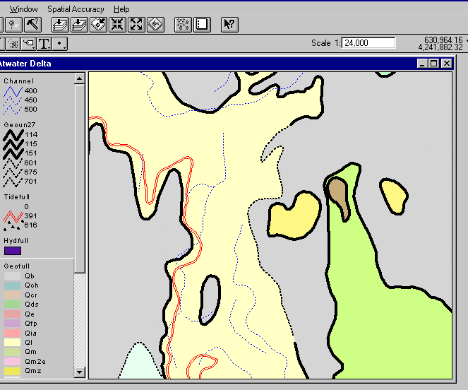 This display illustrates that the features with the greatest uncertainty, late Holocene stream channels, were compiled on the source map with a pen size reflecting greater accuracy than the other features. The late Holocene stream channels are displayed in the wide blue line with the dashed pink line. The width of the blue line in the display is about 450 meters. The boundaries between the geologic units have the least uncertainty in their location. These are the black lines in the display with a narrow purple line. The width of the black line in the display is about 150 meters. The width of the purple line is about 24 meters. The tidal line is represented by the dark green line with the dashed red and yellow lines superimposed on top. The width of the green line is about 300 meters. The red dashed line is about 48 meters representing the symbol size on the compiled source map. The yellow line is about 15 meters wide which was the accuracy assigned in the spatial accuracy extension based on the source scale of 1:24,000.