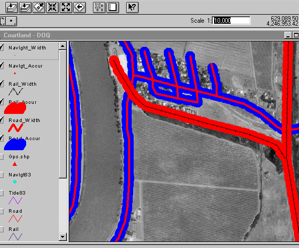 Figure 6 shows the road and rail GIS themes from 1:100,000 scale DLG files with the symbol size set to approximate the width of the features and the uncertainty in their position. The ArcView display scale for this figure is 1:10,000 with the Courtland DOQ in the back ground. The spatial accuracy extension set the symbol size for these themes for this display scale. The lines representing rail lines have an outer red line about 50 meters wide representing the uncertainty in location with a black line representing the U.S. standard gage width of 1.4 meters. The secondary road shown in the display has a red line representing a road width of 10 meters on top of a blue line representing the uncertainty in the position of the road of 50 meters. The road theme contains multilane highways also represented as a single line. Multilane highways in this area have a width of from about 50 to 300 meters including the road median and pavement.