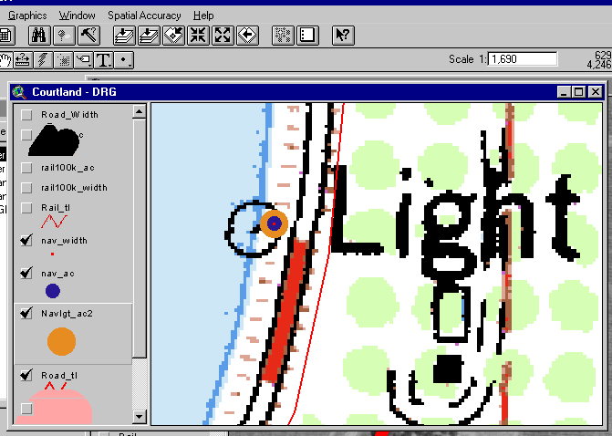 Figure 7 shows a U.S. Coast Guard navigation light along the Sacramento River on the DRG. The spatial accuracy extension has been used to set the marker size for the GIS data layer representing these navigation aids. Three sizes have been set. The outer brown circle represents an assumed accuracy in capturing the USCG coordinates for the light of 20 meters (Actual display diameter is about 15 meters). The inner blue circle represents an assumed accuracy of 10 meters (Actual display diameter is about 8.5 meters). The solid red circle represents the assumed size of the light at 2 meters (Actual display diameter is about 0.8 meters). The open circle is the symbol on the DRG identifying the position of the light and is about 26 meters in diameter.