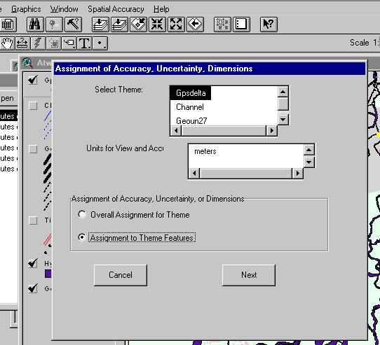 In this dialog, the user selects the point, line, or polygon theme for assigning values for accuracy, uncertainty, or actual feature dimensions. The user has the option of either assigning an overall value for the theme or for assigning different values based on the attributes for the theme.